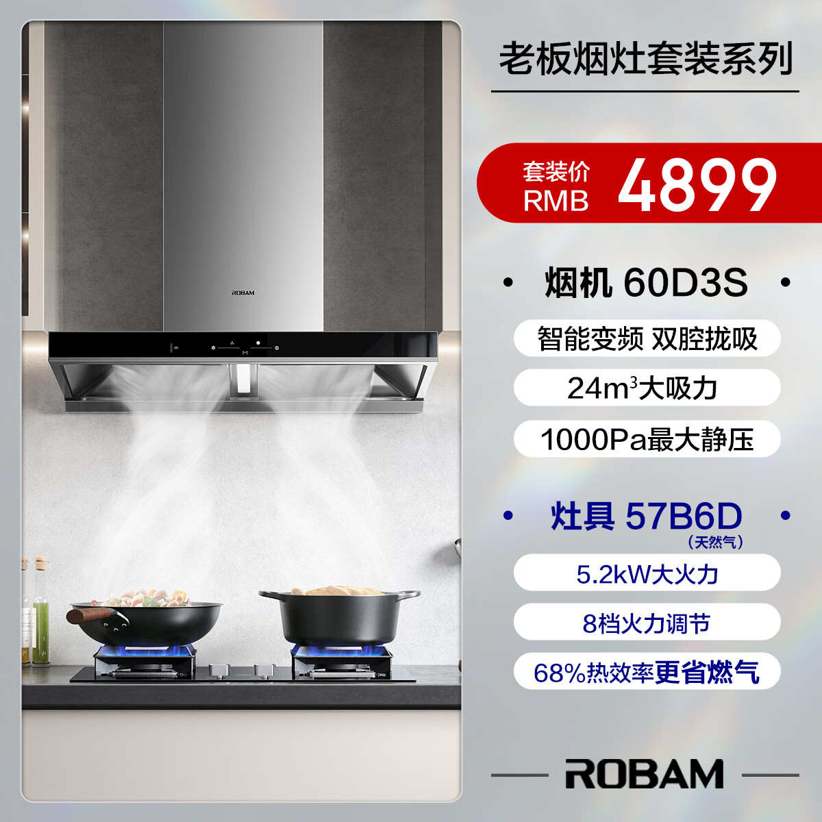 老板(Robam)抽油烟机D3S欧式顶吸双腔变频24大风量家用燃气灶吸油烟机灶具套装60D3S+57B6D(天然气)价格:4899.00元!