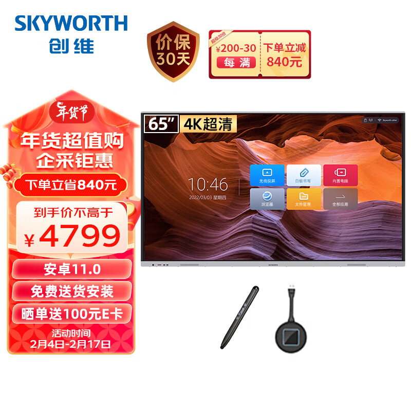 创维(Skyworth)65英寸会议平板一体机 电子白板 无线传屏投影 智能触摸屏电视【商用显示】65DSH5投屏器套装价格:5639.00元!