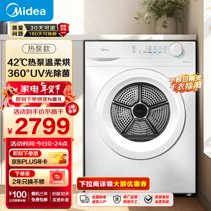 美的(Midea)热泵烘干机 干衣机家用 10公斤大容量 除螨除潮 毛屑过滤 紫外线除菌 白色 MH100V11F价格:2799.00元!