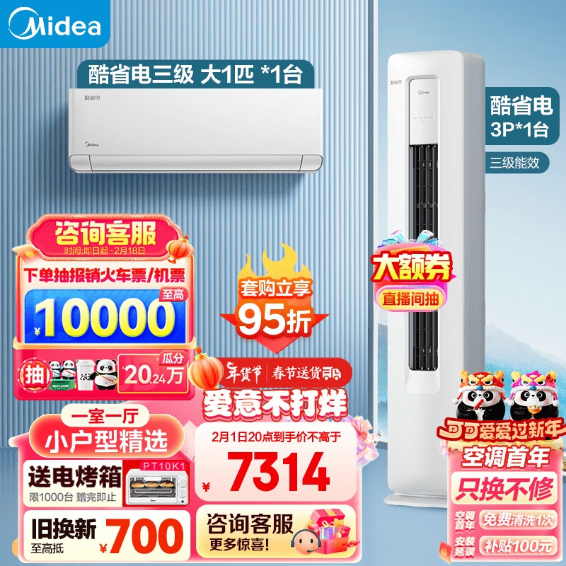 美的(Midea)新能效 酷省电 空调套装 一室一厅 小户型精选(大1匹酷省电+3匹酷省电)价格:7698.00元!