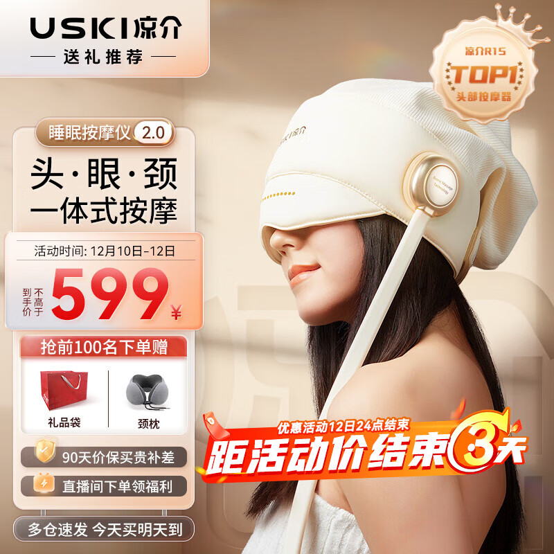 凉介(USKI)头部按摩器头眼颈一体式睡眠仪眼部热敷颈部按摩仪节日礼物长辈实用送男女朋友生日礼物 【睡眠按摩器2.0】R1S 素雅杏白价格:799.00元!