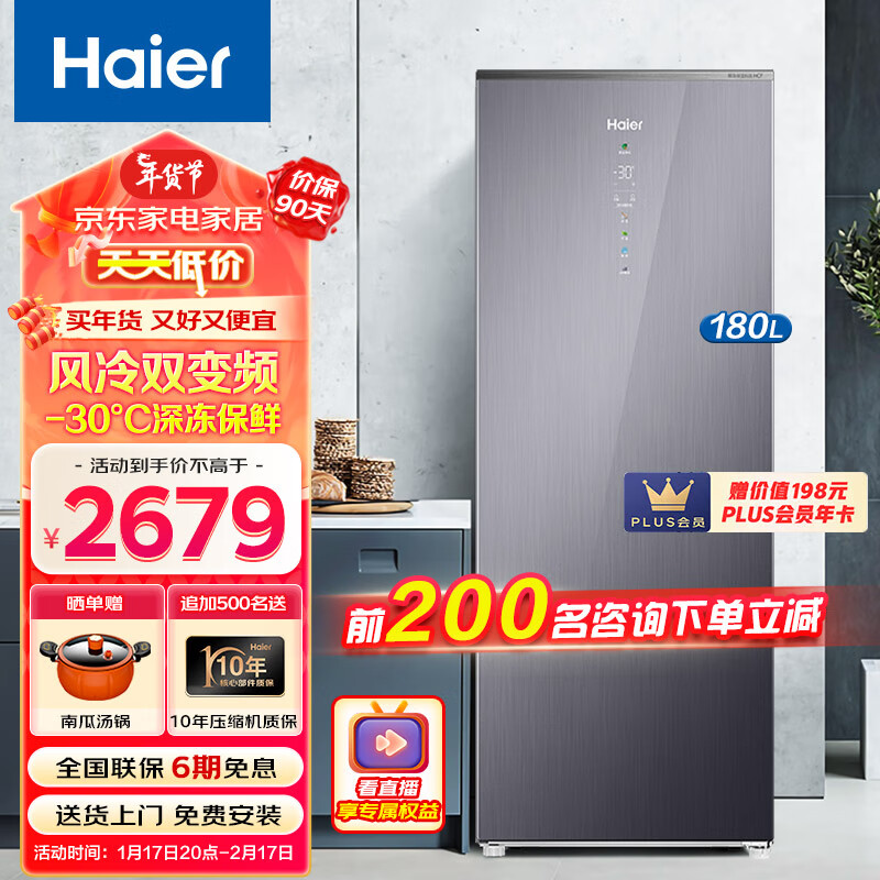 海尔(Haier)冷柜180升家用立式冰柜 风冷无霜 冷藏冷冻抽屉式冷柜小冰柜家用小型冰箱一级能效双变频价格:2699.00元!