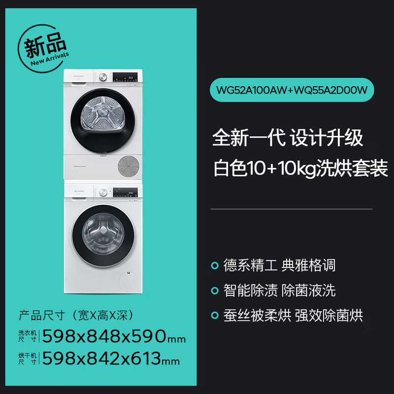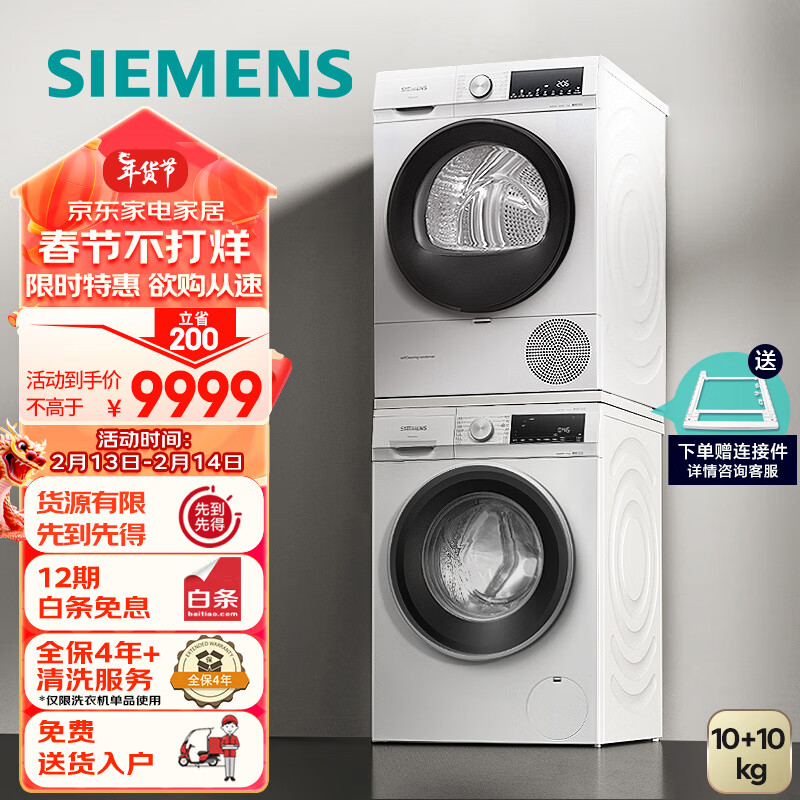 西门子(SIEMENS)iQ300 洗烘套装 10kg智能除渍 除螨 滚筒洗衣机全自动+10kg热泵速烘 烘干机家用 100AW+D00W价格:10199.00元!