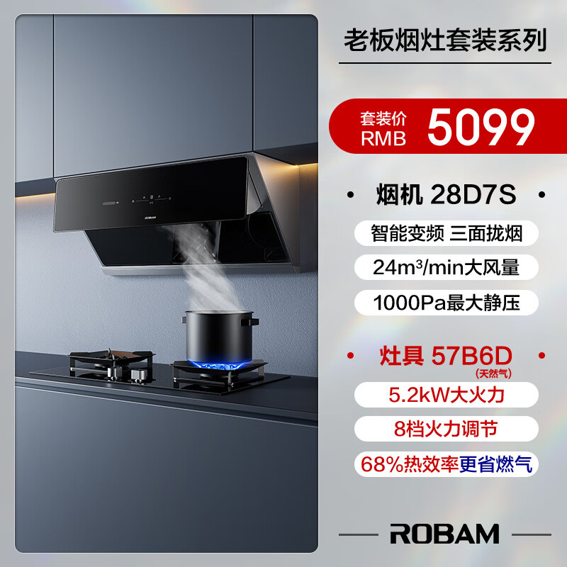 老板(Robam)抽油烟机三面拢烟智能变频吸油烟机家用侧吸24m3/min燃气灶具烟灶套装28D7S+57B6D(天然气)价格:5099.00元!