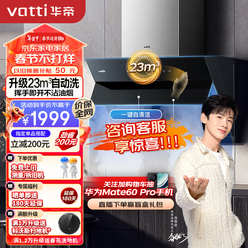 华帝(VATTI)抽油烟机 侧吸式 小尺寸 家用吸油烟机 23风量大吸力 智能挥手智控 高频自动清洗排油烟机 i11170价格:1599.00元!