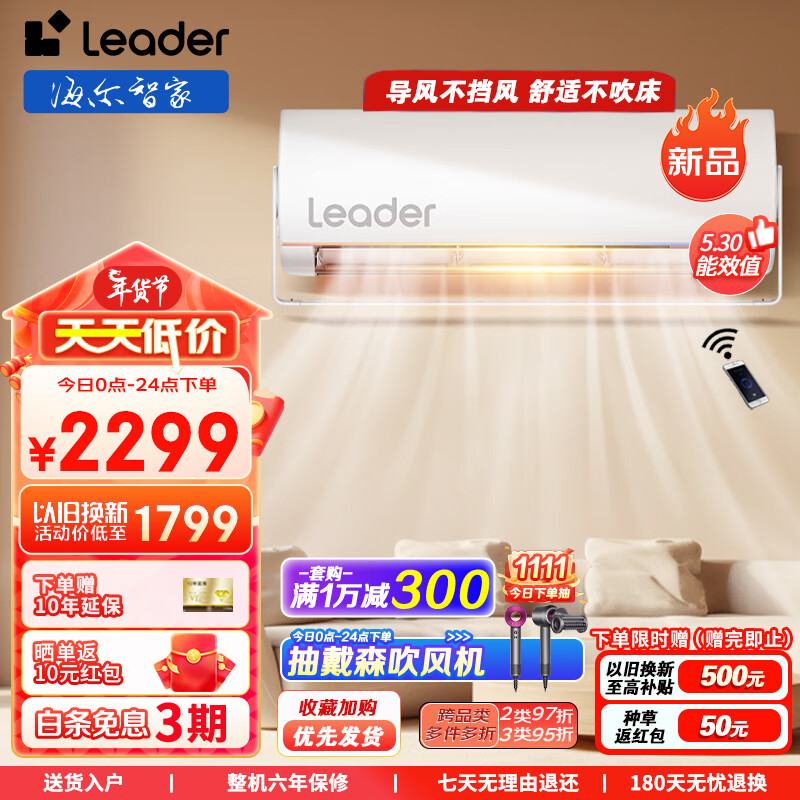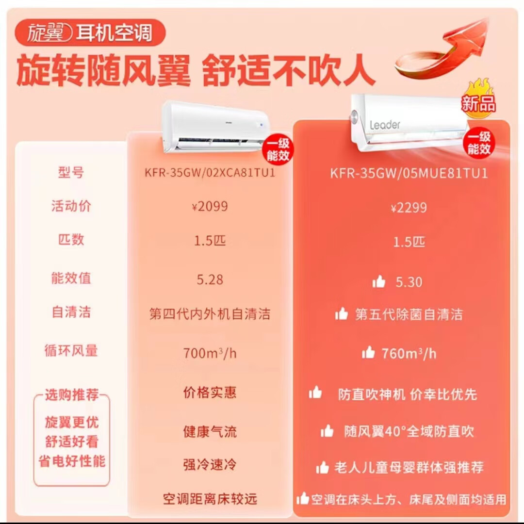 统帅(Leader)空调海尔空调出品 旋翼1.5匹防直吹挂机新一级能效 变频自清洁壁挂式空调旋翼变风急速变温35MUE81价格:2299.00元!