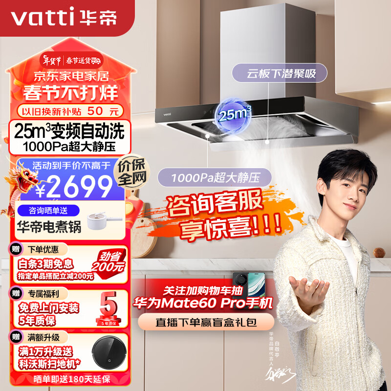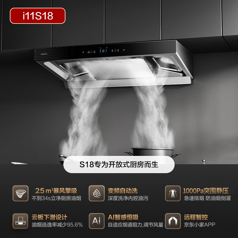 华帝(VATTI)抽油烟机跨界三腔欧式家用变频油烟机25风量大吸力挥手智控自动清洗顶吸吸油烟机京东小家i11S18价格:2799.00元!