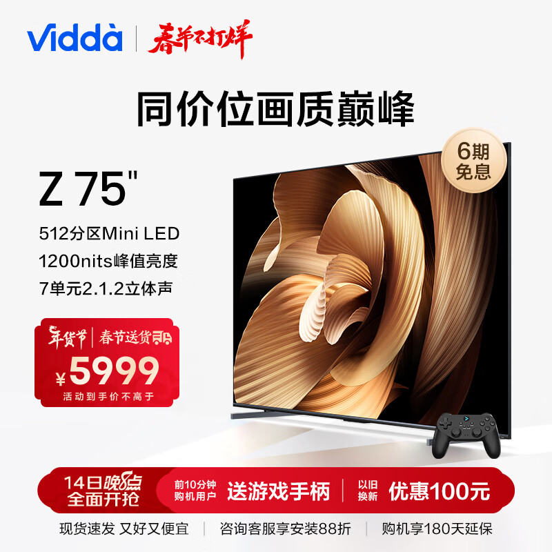 Vidda Z75 海信 75英寸 4+64G 512分区 Mini LED 240Hz 游戏智能液晶电视以旧换新75V7K价格:5999.00元!