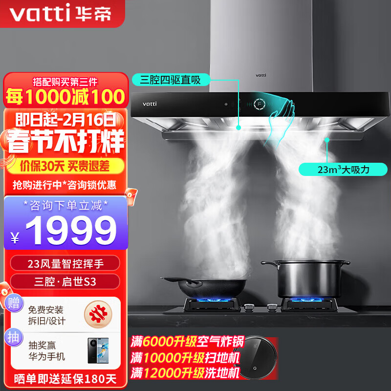 华帝(VATTI)i11180三腔·启世S3欧式顶吸油烟机23立方大吸力风量智控挥手自动清洗 i11180 单烟机价格:1999.00元!