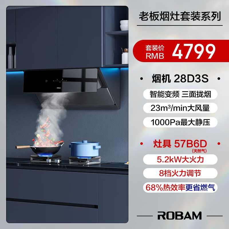 老板(Robam) 抽油烟机探索家D3S家用变频烟机燃气灶烟灶套装23m3/min侧吸吸油烟机灶具28D3S+57B6DT价格:4799.00元!