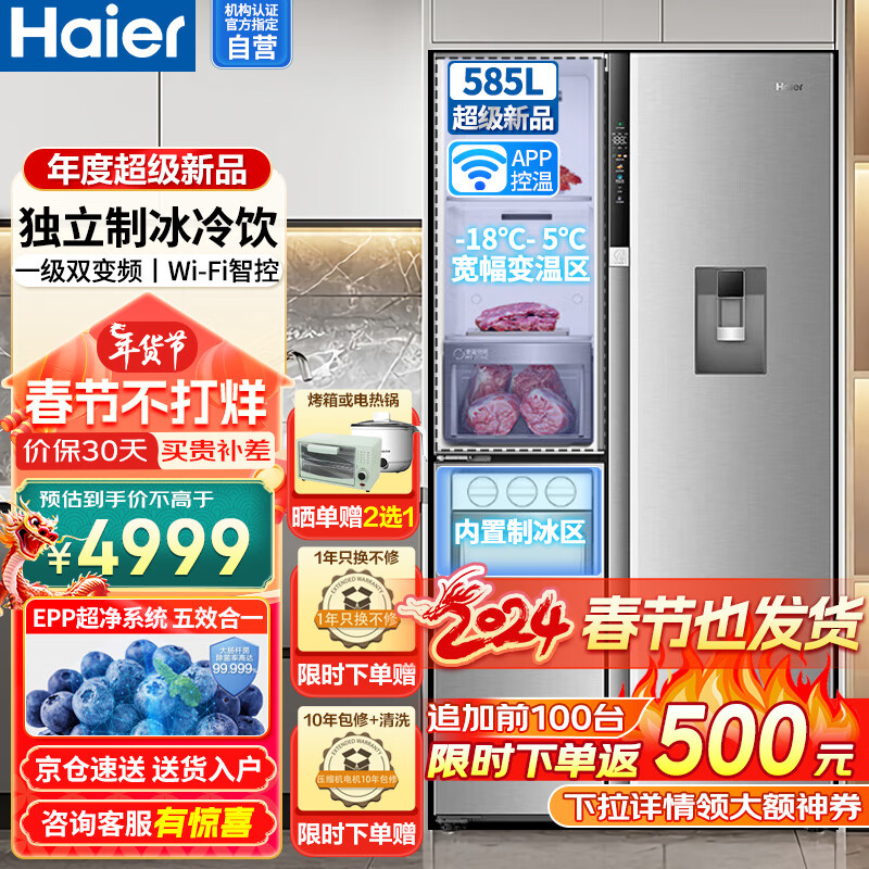 海尔(Haier)冰箱585升对开门T型门冰箱一级能效风冷无霜制冰取冷水EPP超净系统全温区变温BCD-585WGHFTH7S7U1价格:5499.00元!
