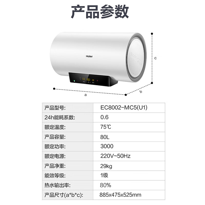 海尔(Haier)80升热水器 家用 3000W变频速热 健康洗浴 智慧物联 防电墙EC8002-MC5(U1)价格:1749.00元!