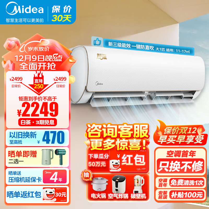 美的(Midea)空调 新三级能效变频冷暖 低噪节能省电挂机家用壁挂式 智控温+速冷暖 大1匹智弧 KFR-26GW/N8MJA3价格:2249.00元!