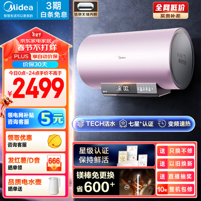 美的(Midea)TECH活水系列电热水器60升免换镁棒 3300W变频速热净肤洗智能八重净滤F6033-HQ3(HE)凝霜芋价格:2699.00元!