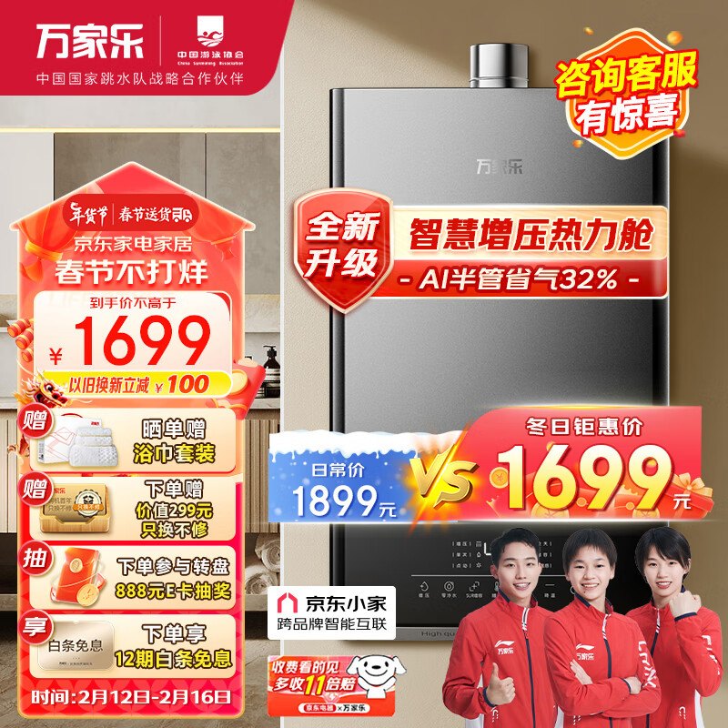 万家乐13升零冷水燃气热水器水气双伺服恒温APP智控智慧热力舱降噪天然气增压JSQ26-13DL1S京东小家价格:1699.00元!