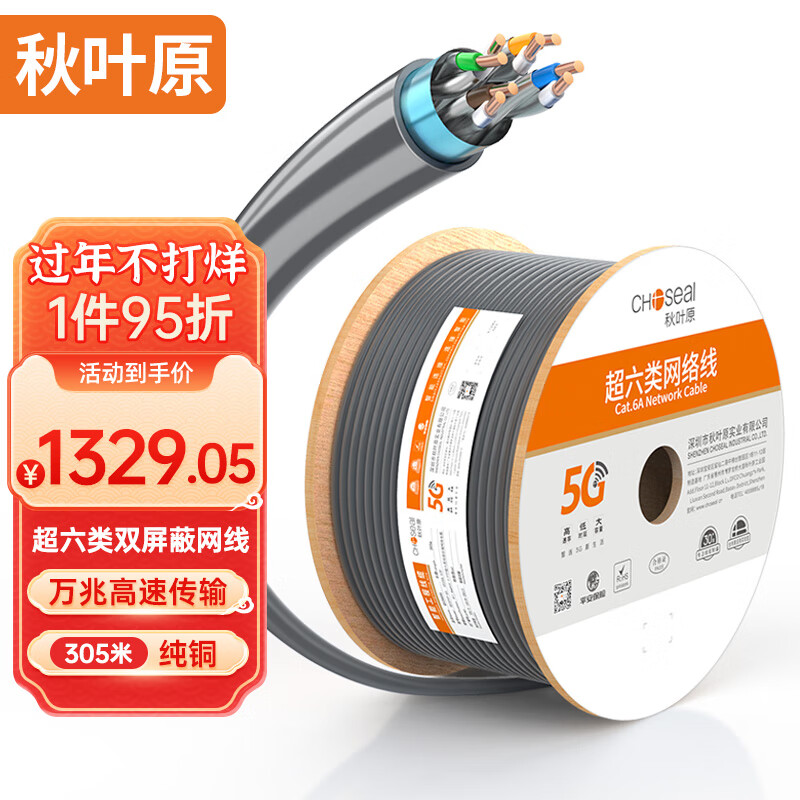 秋叶原(CHOSEAL)超六类双屏蔽网线【商用版】CAT6A类工程家装万兆抗干扰纯铜导体灰色305米QS2669AT305价格:1399.00元!