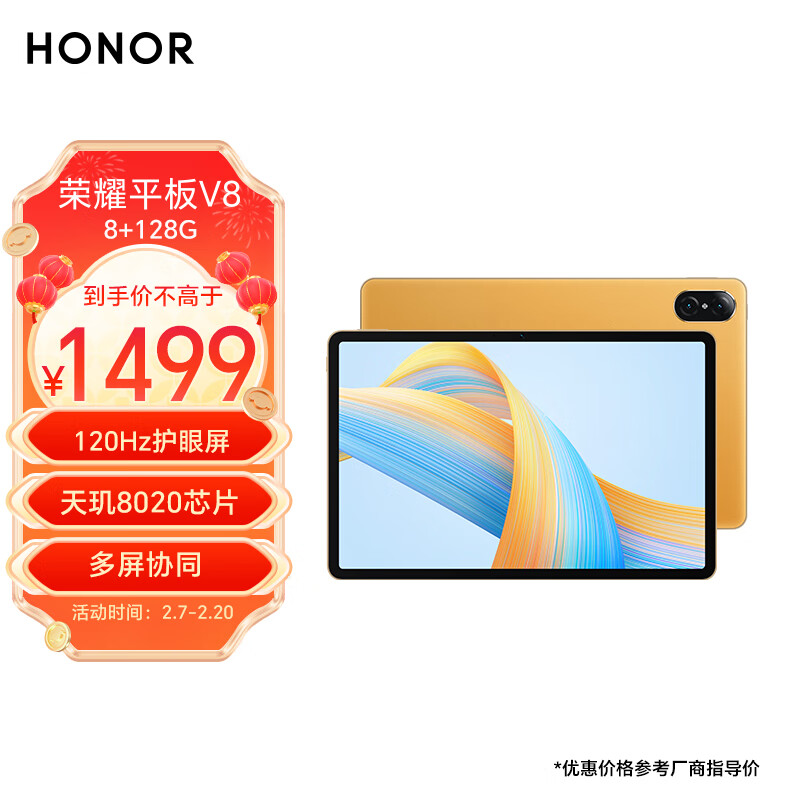 荣耀平板V8 11英寸平板电脑(8+128GB 2.5K超清120Hz护眼屏 7250mAh电池 轻奢素皮)晨晖金价格:1399.00元!