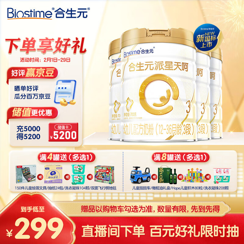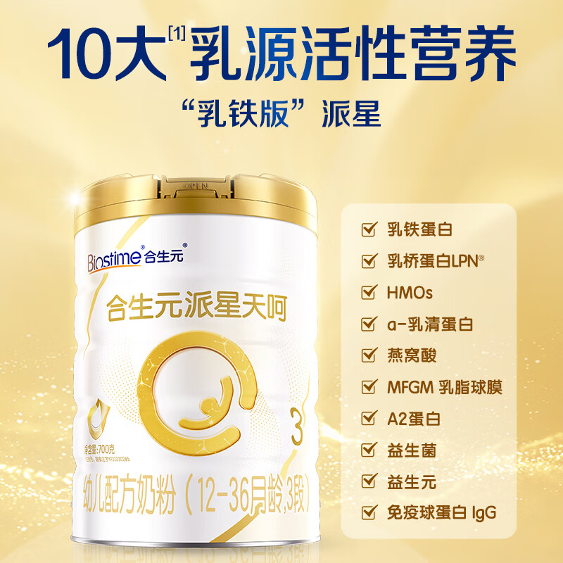 合生元(BIOSTIME)派星天呵幼儿配方奶粉 3段(12-36个月) 700克*4罐新国标乳铁蛋白价格:1328.00元!