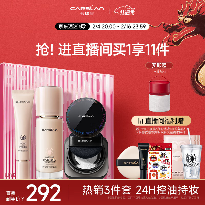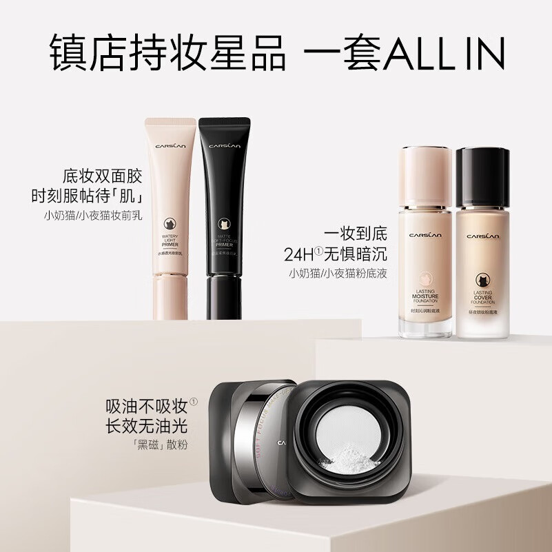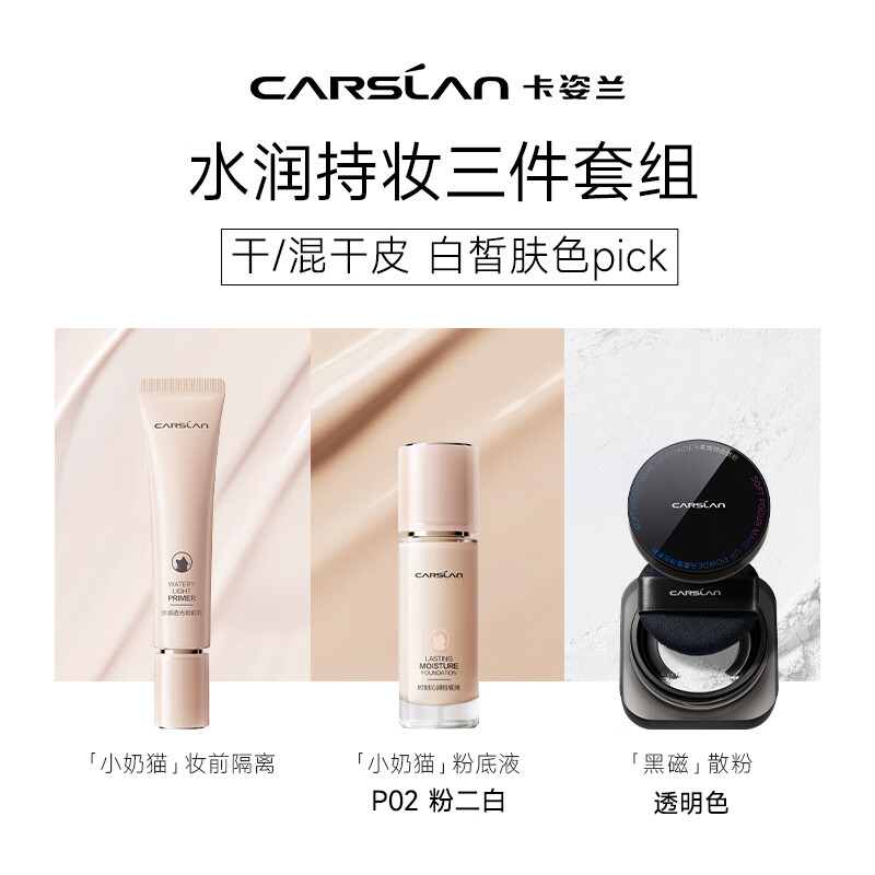 卡姿兰(Carslan)镇店3件套(小奶猫粉底液+妆前隔离+黑磁散粉)彩妆套装 情人节礼物价格:307.00元!