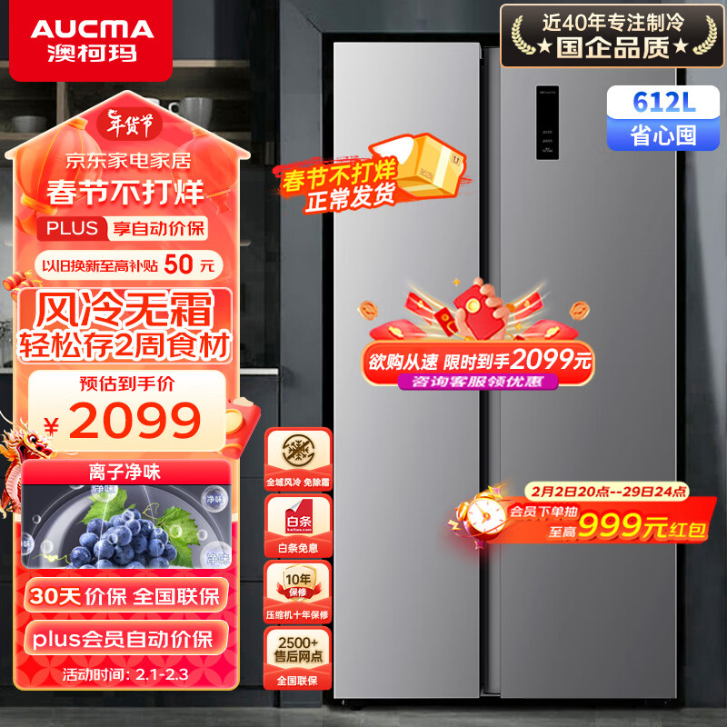 澳柯玛(AUCMA)冰箱双开门家用电冰箱一级能效风冷无霜大容量冰箱二门对开门双变频612升以旧换新 BCD-612WPNE价格:2699.00元!