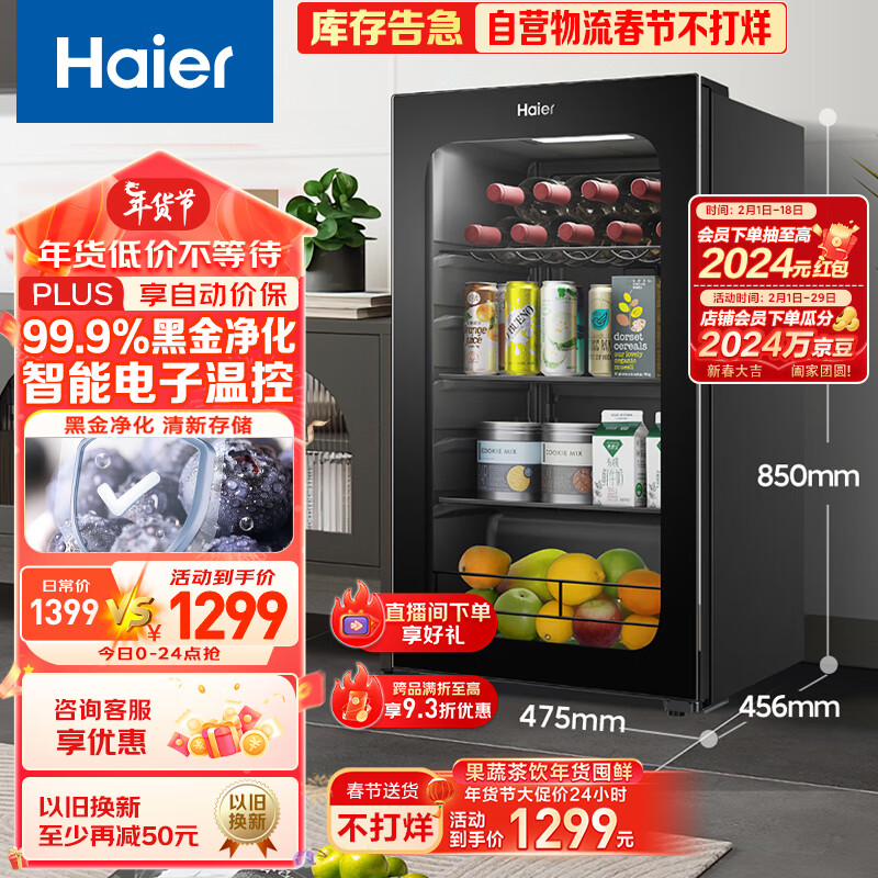 海尔(Haier)92升家用客厅办公室冷藏柜暖藏冰吧 茶叶饮料水果蔬菜保鲜柜囤货小型冰箱DS092LHESD1价格:1299.00元!