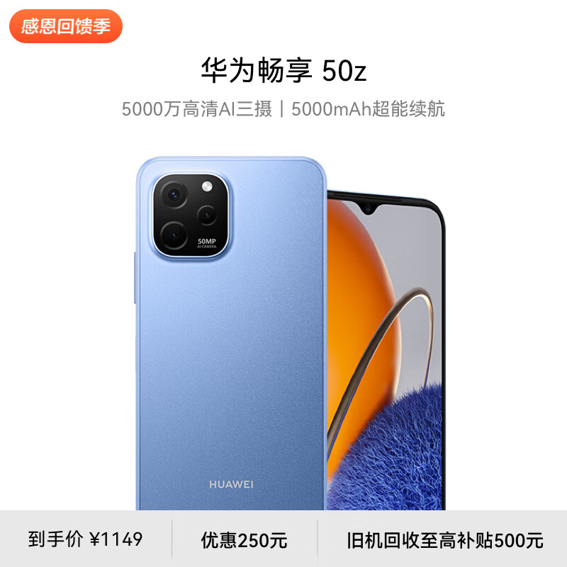 华为畅享 50z 5000万高清AI三摄 5000mAh超能续航 256GB 宝石蓝 大内存鸿蒙智能手机价格:1149.00元!