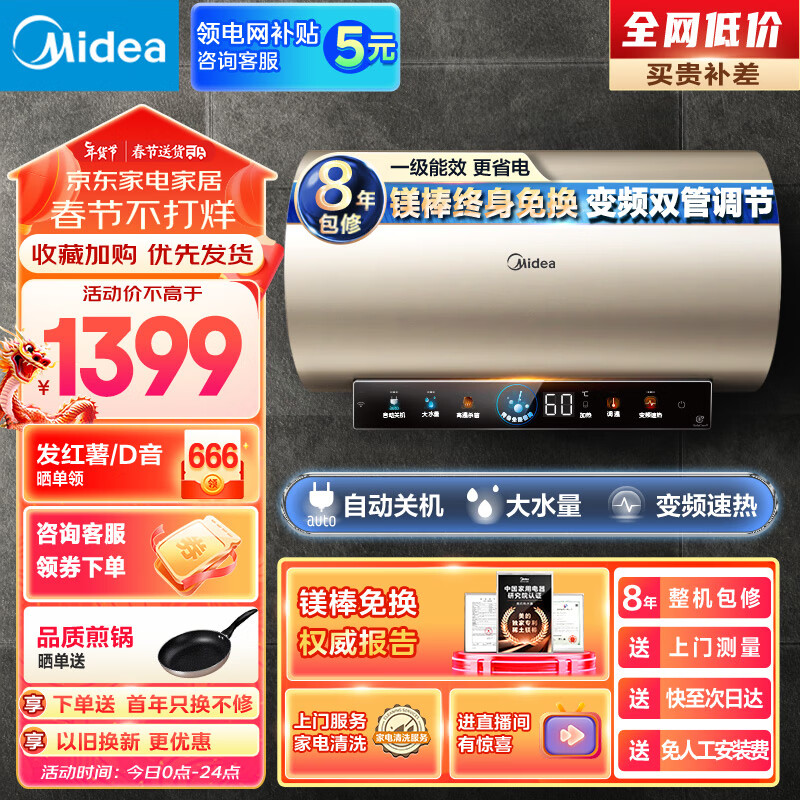 美的(Midea)终身免换镁棒80升电热水器家用储水式3300W/2300W速热变频省电一级能效低耗节能F8033-JE6(HE)价格:1599.00元!
