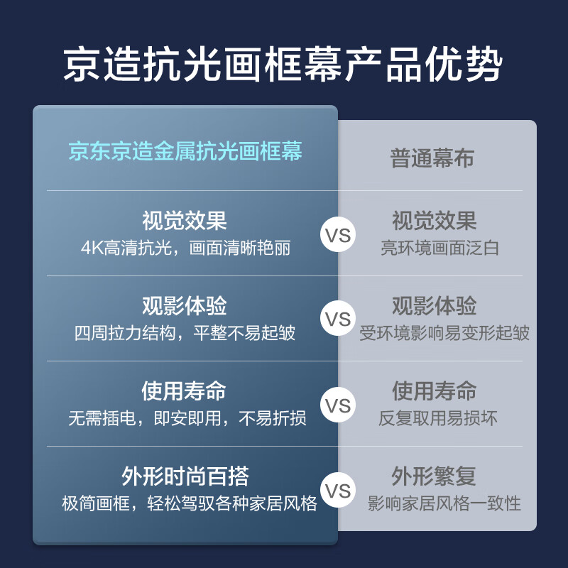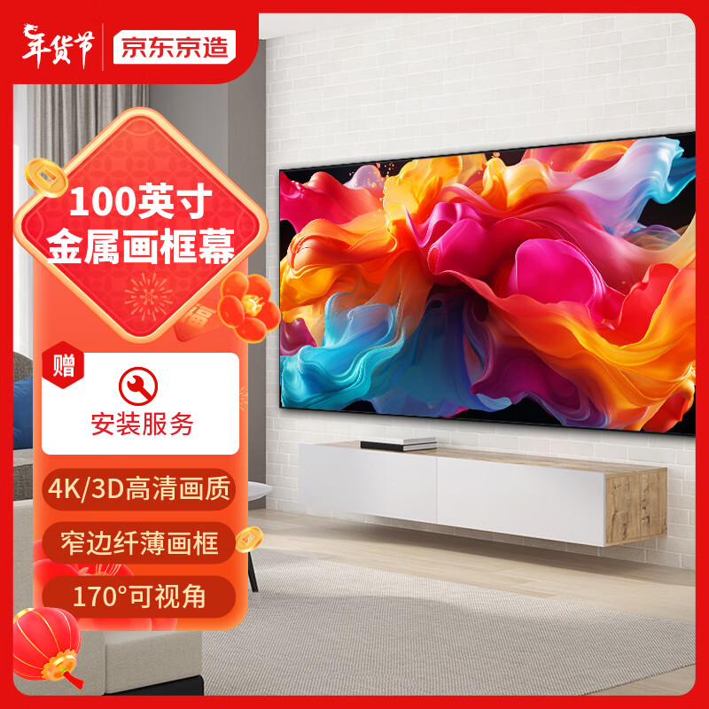 京东京造 金属抗光幕布家用窄边画框投影幕布 100英寸16:9 适配坚果极米当贝小米投影仪 中长焦投影机软幕价格:999.00元!