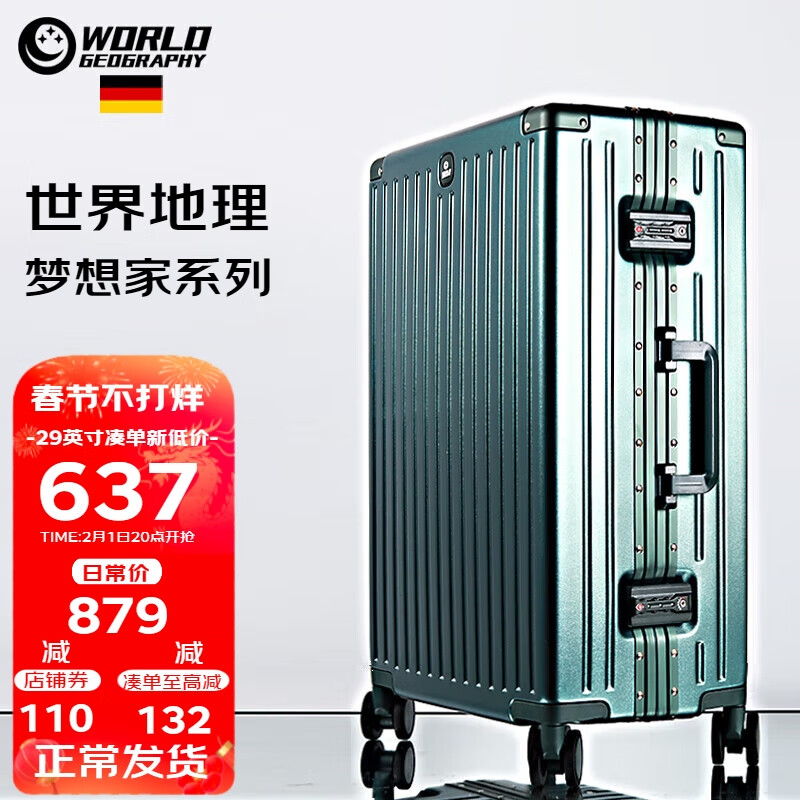 地理德国行李箱男女29英寸铝框旅行箱杯架拉杆箱万向轮密码箱 英伦绿价格:879.00元!