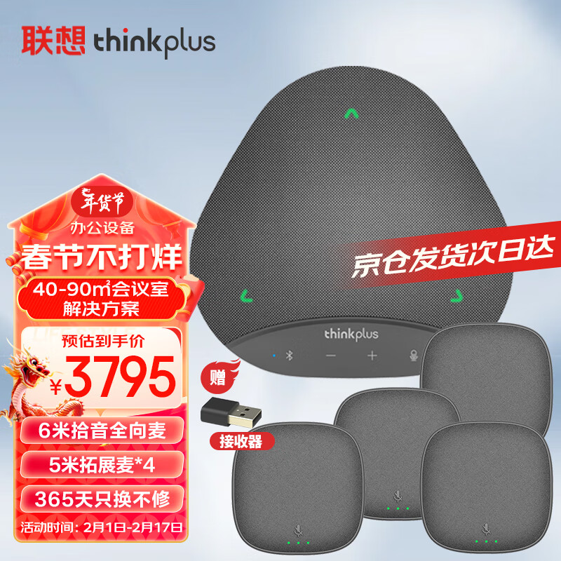 ThinkPlus联想视频会议全向麦克风/蓝牙会议全向麦克风音响/拾音会议扬声器/适用40-90平米(全向麦+收音*4)价格:4080.00元!