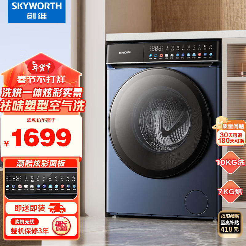 创维(SKYWORTH)10公斤变频滚筒洗衣机全自动 洗烘一体 除螨 炫彩触控 家用大容量 XQG100-B63RBH价格:1699.00元!