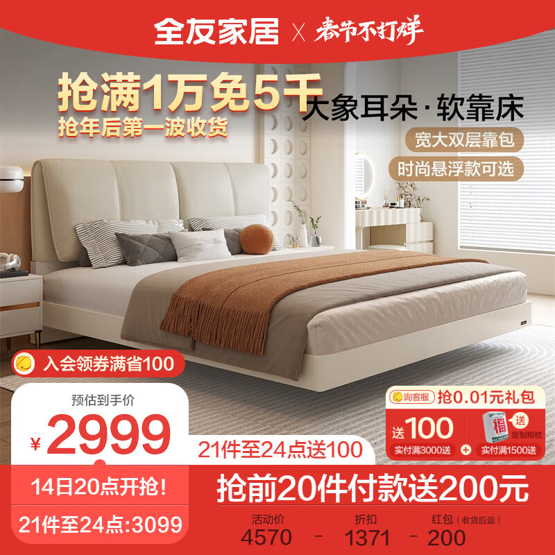 全友家居 床悬浮床双人床1.8米大象耳朵软床主卧大床婚床家具129303价格:4570.00元!