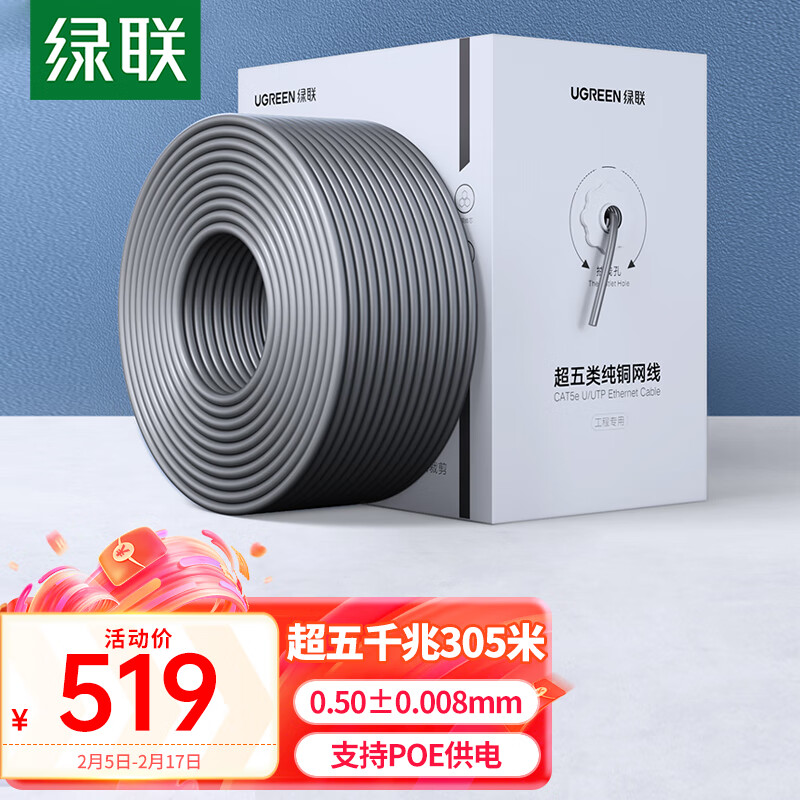 绿联 超五类千兆网线【0.50±0.008mm纯铜线芯】CAT5e千兆非屏蔽箱线 家装POE监控工程布线305米 60547价格:599.00元!