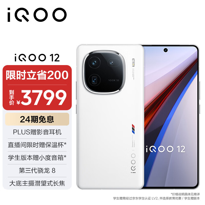 vivo iQOO 12 12GB+256GB传奇版 第三代骁龙 8 自研电竞芯片Q1 大底主摄潜望式长焦 5G手机价格:3999.00元!