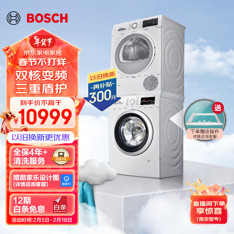 博世(BOSCH)洗烘套装10+10KG【云朵白】大容量全自动滚筒1400转洗衣机家用 热泵烘干蚕丝被精护282602+254D00价格:12199.00元!