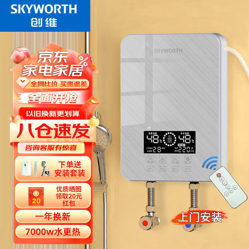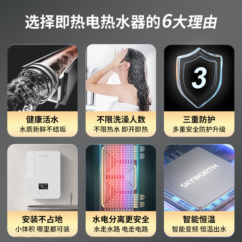 创维(Skyworth)即热式电热水器【免费上门安装】家用节能变频恒温洗澡机多功率可调D876拉丝银7000W价格:559.00元!