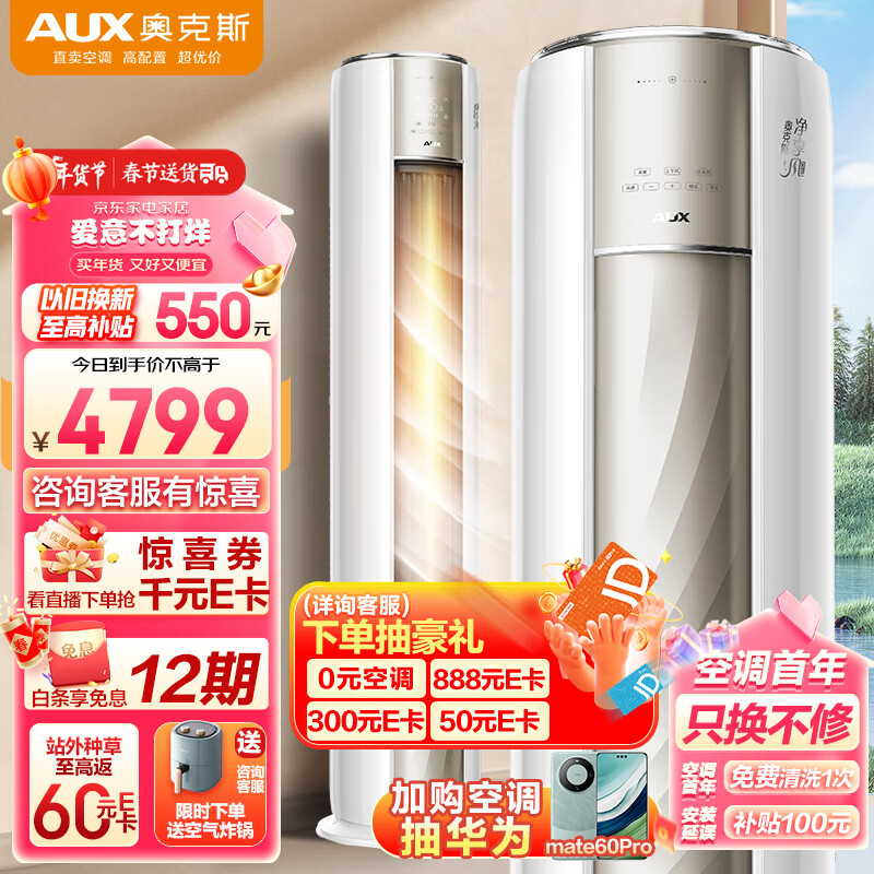 奥克斯(AUX)空调2匹柜机 新一级能效 客厅立式圆柱 变频冷暖节能 WiFi智控 KFR-51LW/BpR3AQJ1(B1)价格:4799.00元!