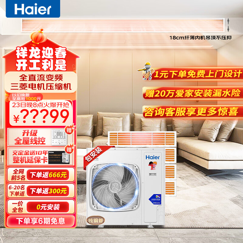 海尔(Haier)中央空调一拖四风管机5匹小多联一级能效全直流变频嵌入式智尊+ RFC125MXSAVB(F)价格:22699.00元!