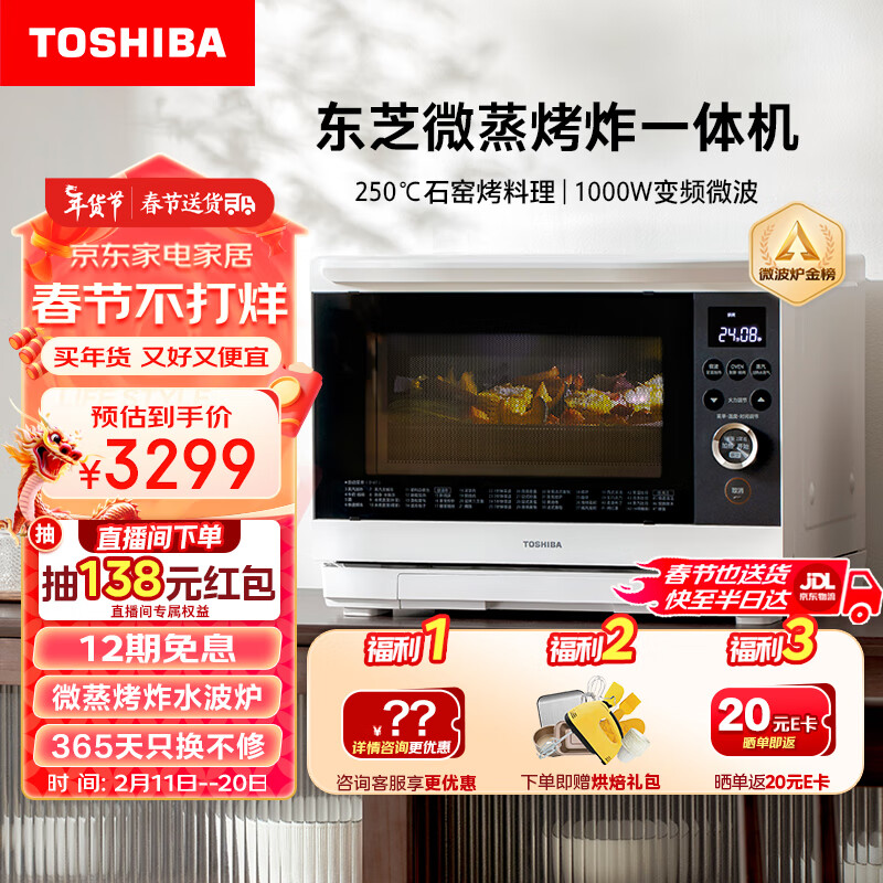 东芝XD95CNW微蒸烤炸一体机水波炉家用台式变频微波炉电烤箱空气炸蒸箱平板隐藏烤管白色26L价格:3299.00元!
