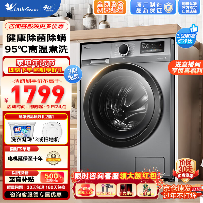 小天鹅(LittleSwan)滚筒洗衣机全自动变频 10公斤大容量1.08高洗净比 除菌净螨羽绒服洗 智能WIFI家电 TG100YQ2价格:1799.00元!