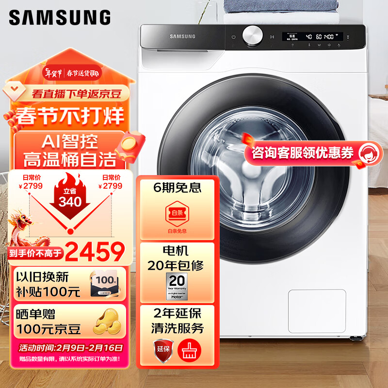 三星(SAMSUNG)10.5公斤滚筒洗衣机 蒸汽除菌 高温桶自洁 15分钟快洗 泡泡净洗10公斤洗衣机WW10T504DAE/SC 白价格:2459.00元!