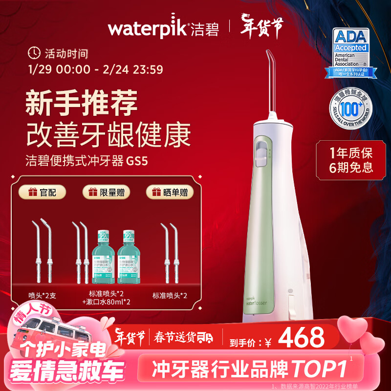 洁碧(Waterpik)冲牙器便携式电动洗牙器水牙线洁牙器家用立式预防牙结石全身水洗极光系列GS5绿 年货节情人节礼物价格:528.00元!