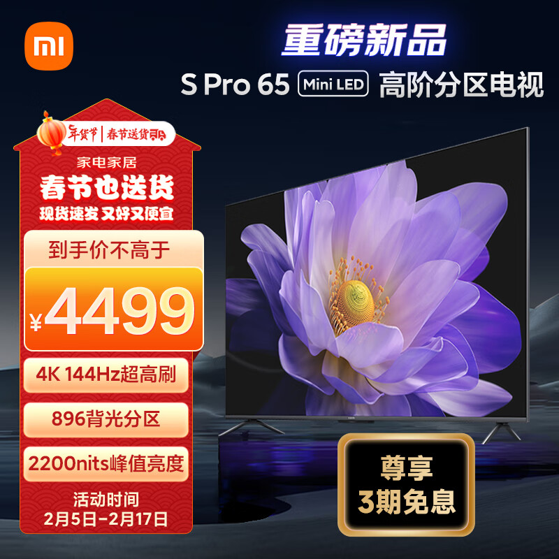 小米电视 S Pro 65英寸 Mini LED 2200nits 896分区 4GB+64GB 小米澎湃OS系统 液晶电视机L65MA-SM价格:4499.00元!