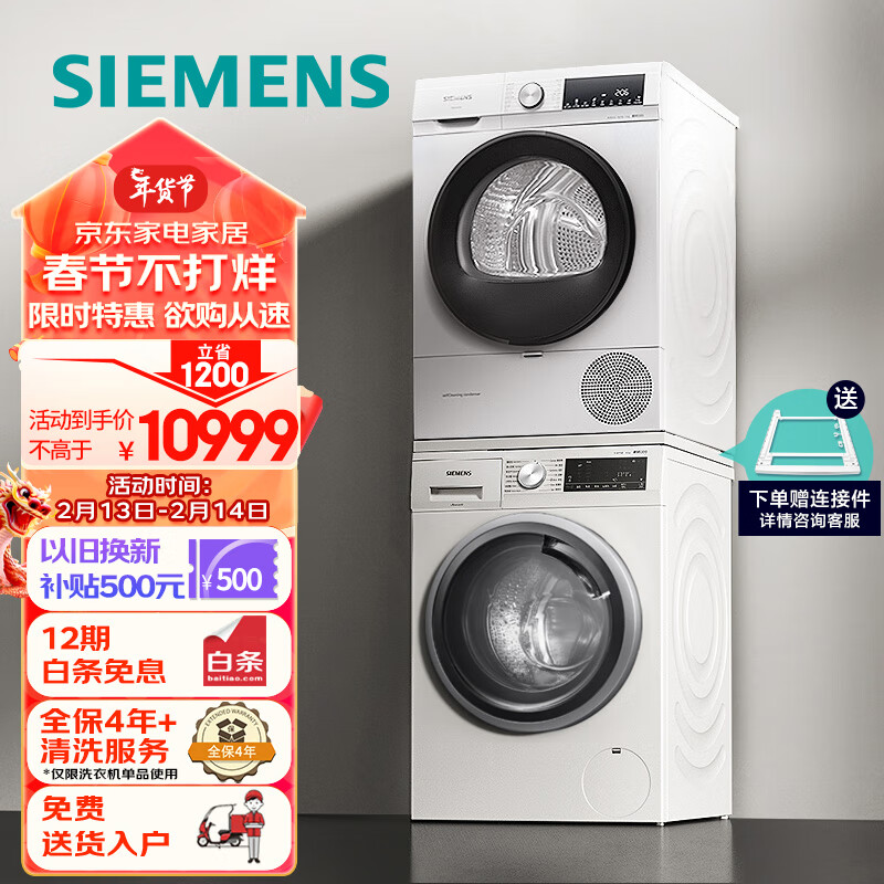 西门子(SIEMENS)洗烘套装 10kg除菌滚筒洗衣机+10kg热泵烘干机家用 WM12P2602W+WQ55A2D00W价格:12199.00元!