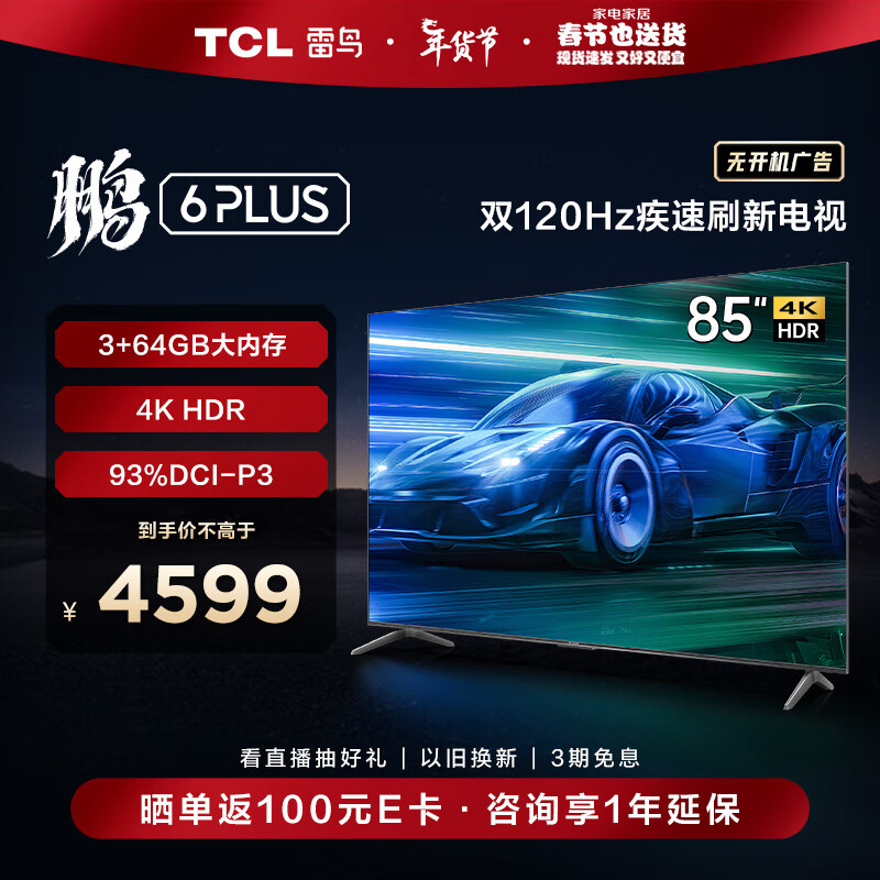 TCL雷鸟 鹏6PLUS 85英寸游戏电视 超薄屏 4K超高清 3+64GB 液晶平板客厅电视机以旧换新85S365C价格:4599.00元!