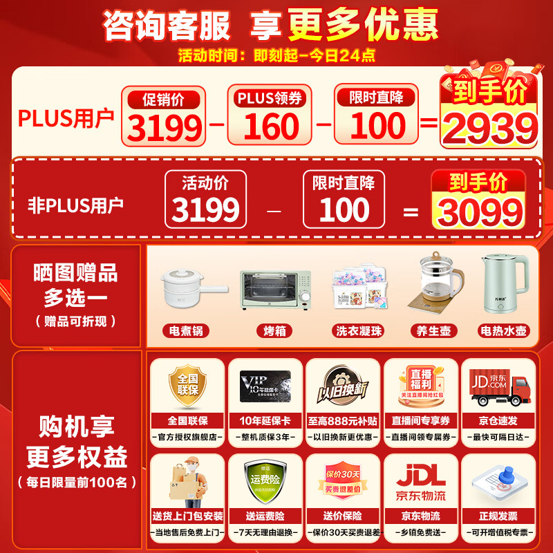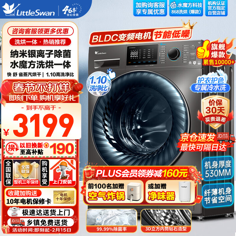 小天鹅(LittleSwan)滚筒洗衣机洗烘一体全自动 水魔方防缠绕 冷水洗护色护形一级能效变频节能低噪V868价格:3099.00元!