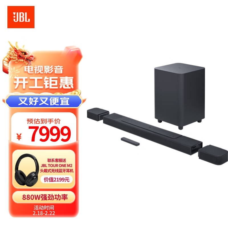 JBL BAR1000 次旗舰款 7.1.4杜比全景声音响 回音壁 家庭影院 电视音箱套装Soundbar价格:7999.00元!