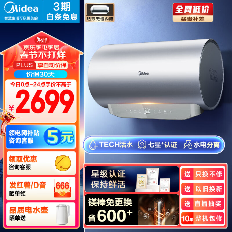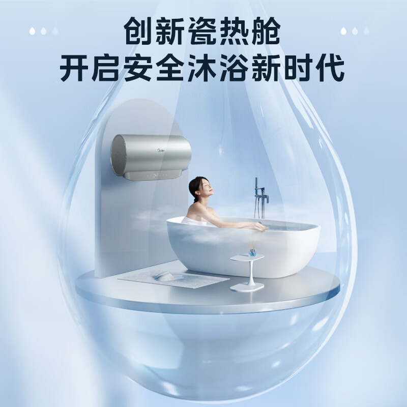 美的(Midea)TECH活水系列电热水器60升 3300W变频水电分离瓷净舱净肤洗一级能效免换镁棒F6033-HQ5(HE)价格:2899.00元!
