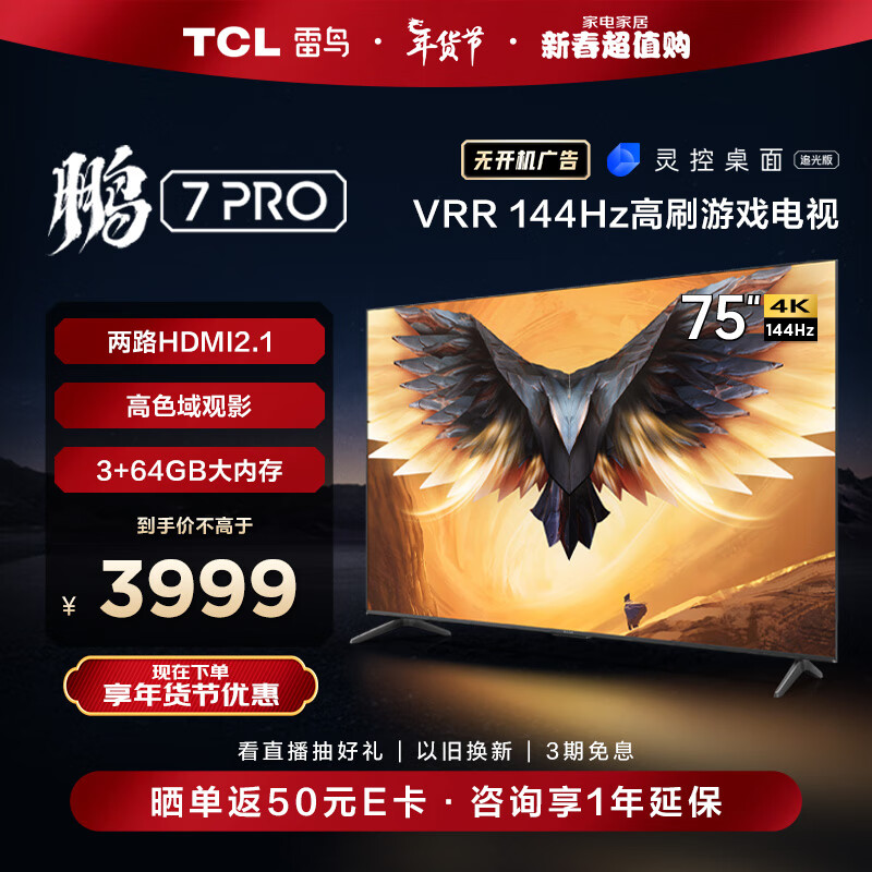 TCL雷鸟 鹏7PRO 75英寸游戏电视 144Hz高刷 HDMI2.1 4K超高清 3+64GB 超薄液晶平板电视机75S575C价格:3999.00元!
