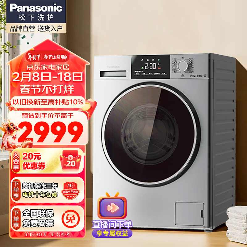 松下(Panasonic)滚筒洗衣机全自动 洗烘一体10公斤 泡沫净空气洗 除螨除菌 变频电机 XQG100-ND1MT价格:3098.00元!